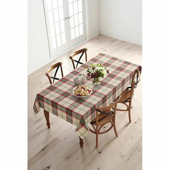 Give your dining space a holiday makeover with this St. Nicholas Square white farmhouse plaid tablecloth.